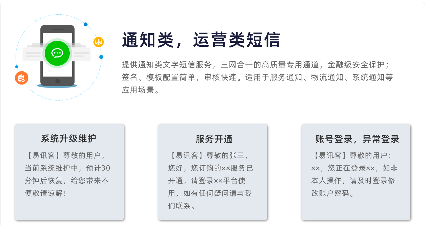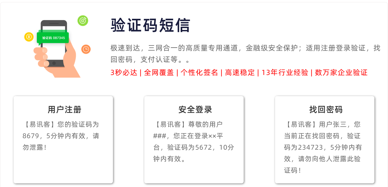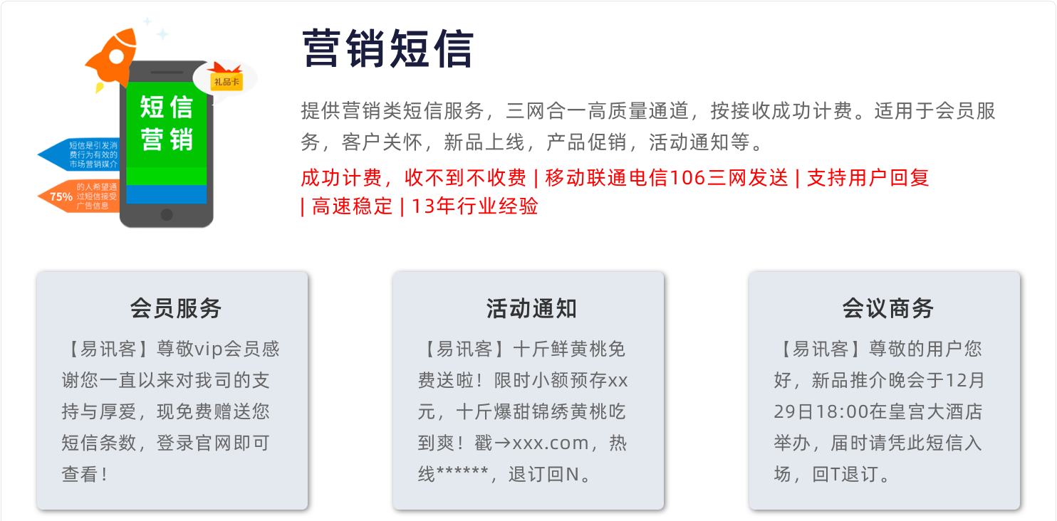 答:我们有多条国内最稳定的短信通道,保障您的每一条短信能够及时无误发送到接收方。由于运营商原因或手机无信号、黑名单等造成收不到情况,可联系客服处理。收不到不收取费用!